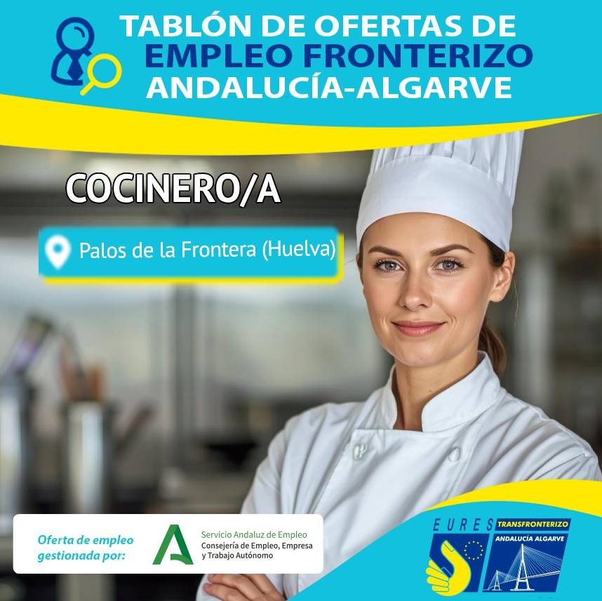 El EURES-T AA informa de esta vacante de empleo para trabajar como COCINERO/A en Palos de la Frontera (Huelva).
