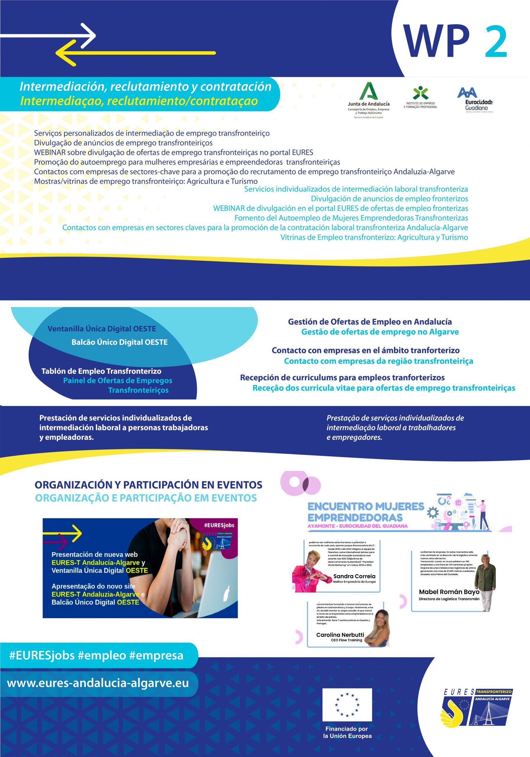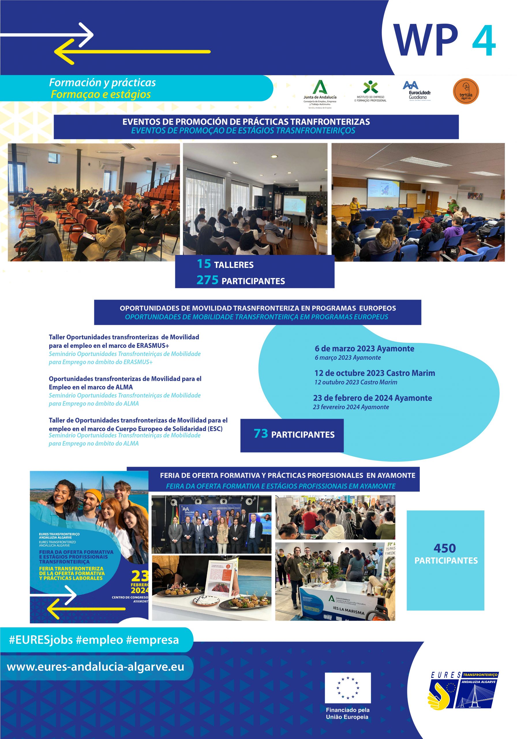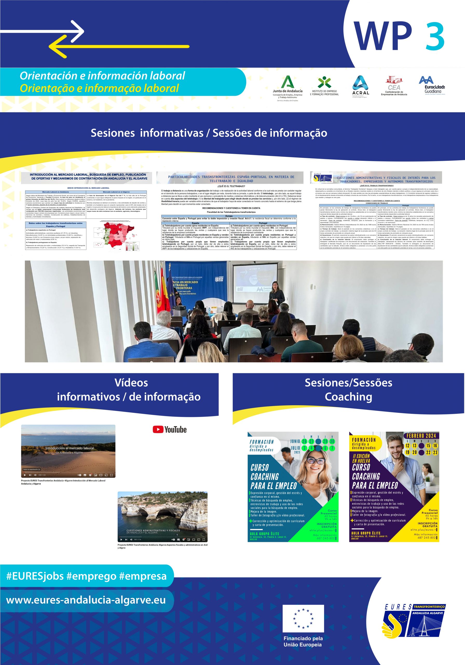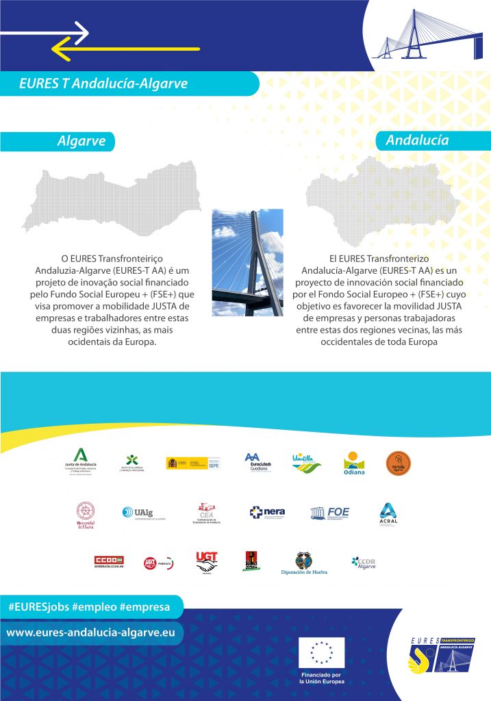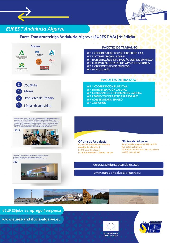 La coordinación de la asociación EURES Transfronteriza Andalucía-Algarve, con motivo del último Comité de Evaluación y Seguimiento celebrado en la localidad de Ayamonte el 24 de marzo de 2024, editó estas 12 infografías que recogen las principales actividades desarrolladas dentro del proyecto financiado por la Comisión Europea para el periodo abril/2022 a marzo/2024.